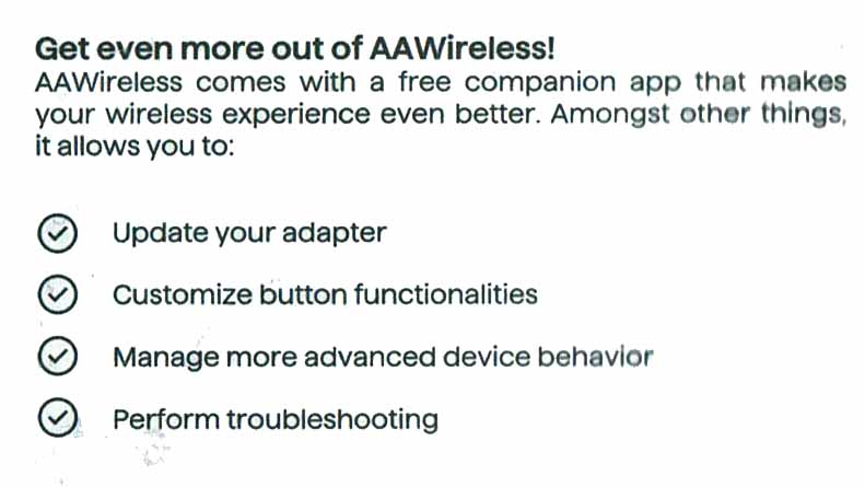 Free AA Wireless App: The app, available in both app stores, allows you to update the device and manage its settings. (see Photo 2)